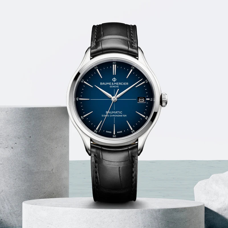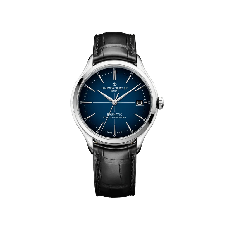 A Swiss chronometer watch for men, the Baume et Mercier Clifton Baumatic 10467 is a fitting timepiece for the modern individual. It features a gradient blue dial paired with a satin-finished stainless steel case and a finely-stitched black alligator strap.