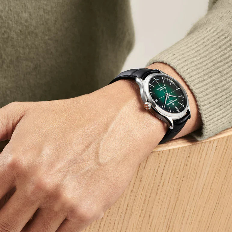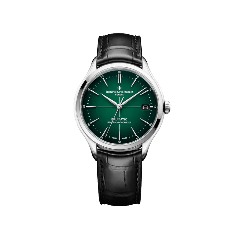 This COSC-certified Baume et Mercier wristwatch is powered by the manufactured automatic calibre Baumatic. It has a green lacquered dial with a white crosshair in the centre and rhodium-plated hands and indexes. A classic date aperture at 3 o'clock completes the urbane aesthetic of this Swiss-made watch.