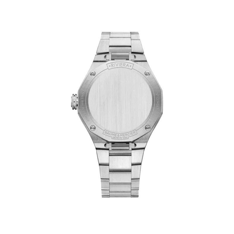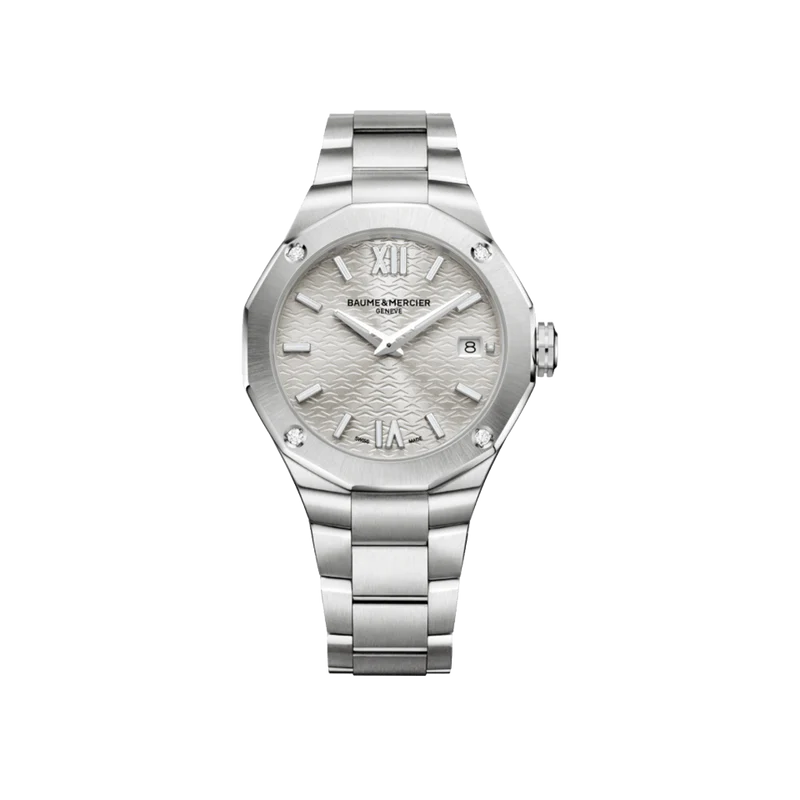 Driven by a “Swiss-made" quartz movement, this Baume et Mercier Riviera is adorned with a silver-coloured dial and mounted on a metal bracelet. Loyal to the original design, it keeps a dodecagonal bezel; a unique decor; and an interchangeable strap system. Recommended for assertive personalities.