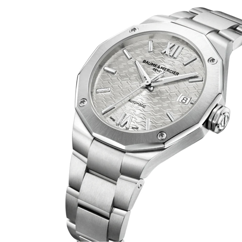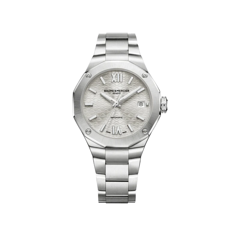 This Baume et Mercier Riviera in 36mm is equipped with an automatic movement for active and independent women. Combining a dodecagonal case, a silver-coloured dial with decor, and a metal interchangeable bracelet, this timepiece offers an off-beat elegance and Swiss precision.