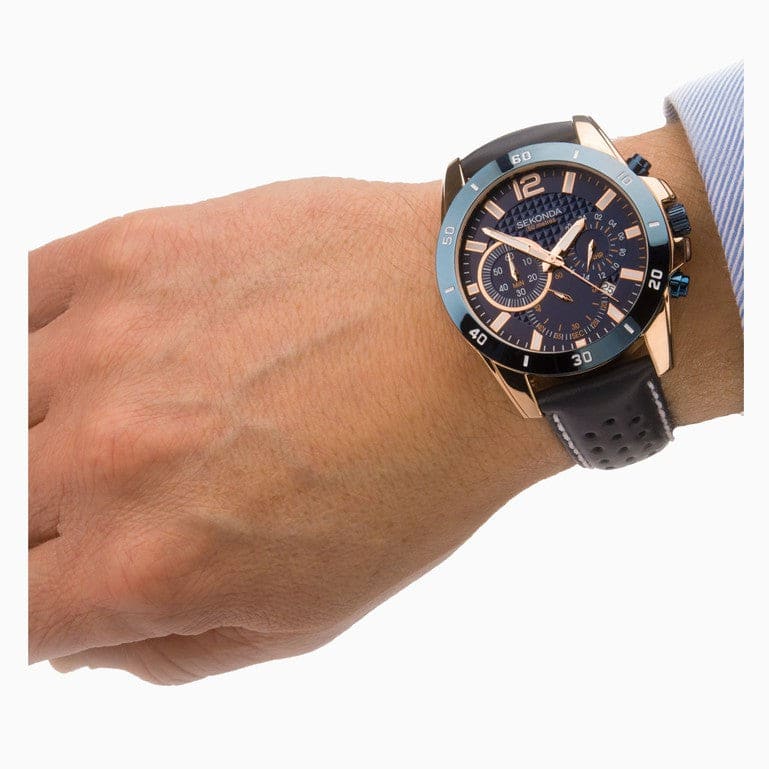 This chronograph watch features a two-tone rose gold and blue plated case housing a deep blue patterned dial with a date display. The timepiece is fastened with a complementing dark blue leather strap with contrasting stitching. The functions include 1 second chronograph timing up to 1 hour, 24-hour read-out and water resistance to 50m.