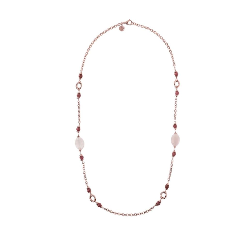 A bold and fancy oval rolò link chain, with alternated stations in dark pink rhodolite and bold nuggets in pastel romantic, soft pink rose quartz. The links are embellished by a series of oval shiny elements in Golden Rose, the 18kt rose gold plated unmistakable blend. Wear this pink stationary necklace alone or pair it to the matching earrings.